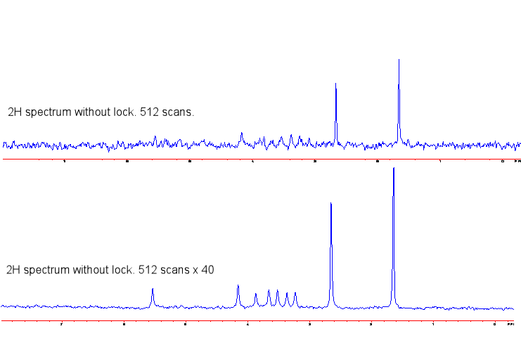 Use regular 5 mm BB or 3 mm BB probe to acquire 2H spectrum, you have to disable the lock channel. Just disconnect the lock cable form the probe and then turn off lock (set the lock power and lock gain to zero and click lock off). In this case, there is no lock for the experiment and the peaks will shift because of manget drifting during the acquisition. Most 2H NMR spectrum has acquire more than three hours, the magnet drifting will be about few hz, this is not accetable. The best way to solve the problm as following: