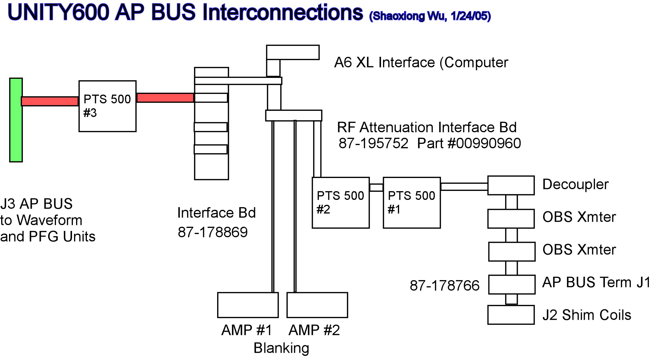Unity600 AP BUS Interconnection (3 Channels) Signal Interface (J3) for Waveform and PFG borads -----> PTS 500 #3 -----> Interconnection board (output) 87-178869 (Input) <----- XL Interface board (Input) <-----RF Attenuation Board (87-195752) -----> PTS #2 -----> PTS #1 -----> Decoupler Board -----> Obs Xmtr board (B)-----> Obs Xmtr Board(A) ----->AP BUS Terminater Bd (87-178766) J1 -----> Shim Control Board (J2). Power for all components on the BUS should be ON. Otherwise it will be an ERROR Message. The Blanking cables of all Amplifiers are from RF Attenuation Bd. All Frequencies output from PTSs are controlled by computer though AP BUS.